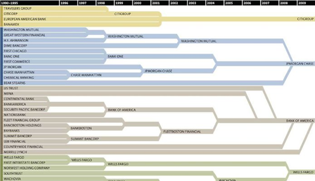 Lo hace incluso más interesante el hecho de que este gráfico y estudio no incluyen la totalidad de los bancos que hoy han llegado a ser absorbidos por los 4 grandes bancos de EE.UU que aparecen destacados a la derecha.
