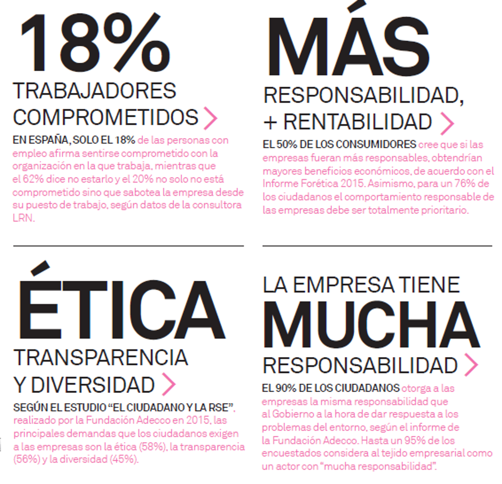 Otro estudio de la Fundación Adecco publicado en 2015, “El ciudadano y la RSE”, arroja que casi la mitad de los españoles (49%) realiza un consumo crítico, descartando las marcas que no considera responsables y poniendo en valor aquellas que apuestan por el respeto al medio ambiente o los derechos humanos. “La sociedad actual demanda ejemplaridad, transparencia y comportamientos éticos”, indica Morales. “Solo las empresas que incorporen estos valores serán competitivas en el medio y el largo plazo, pues podrán conectar con amplias capas de la población. Las que no lo hagan generarán rechazo y en última instancia dejarán de ser rentables”, continúa.