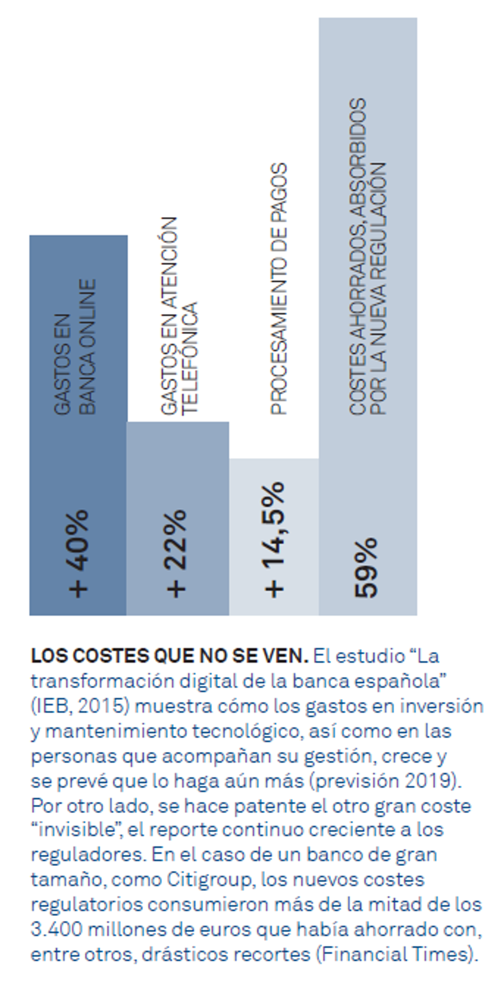 En tercer lugar, la actual reconversión digital del sector bancario, con el impulso de servicios online y móviles, está requiriendo de elevadas inversiones por parte de las entidades.