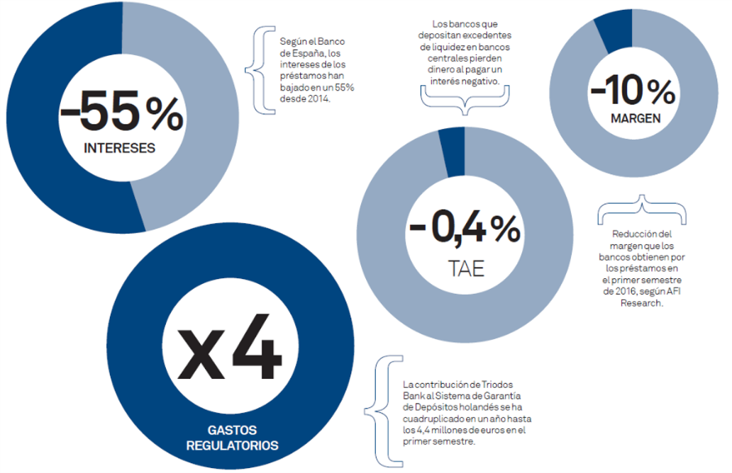 La necesidad de dedicar más recursos a la regulación la ha convertido en un elemento de presión más en las cuentas de los bancos. En el caso de Triodos Bank, solo la contribución al Sistema de Garantía de Depósitos holandés se ha cuadruplicado en un año, pasando de 1,1 millones de euros en el primer semestre de 2015 a 4,4 millones de euros en el mismo periodo de 2016.