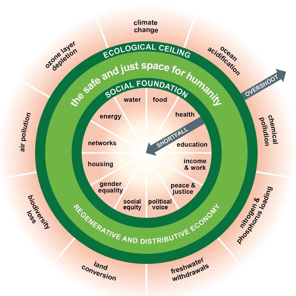 Raworth argumenta que nuestra actividad económica debería desarrollarse en el espacio situado entre una base social y un techo ecológico. En la práctica, esto significa que todo el mundo debe tener acceso a los bienes básicos —comida, vivienda y salud— pero dentro de los medios y recursos disponibles en el planeta.