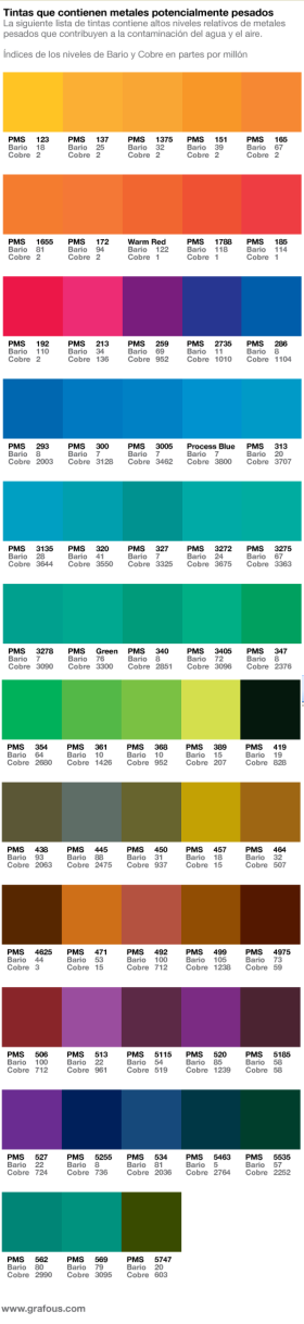 Una paradoja respecto a un color básico en la naturaleza y asociado a la ecología que también aparece en este gráfico del blog sobre diseño sostenible Grafous. En él se asocian colores de tinta y metales potencialmente contaminantes que se han requerido para conseguirlos, constatando que el verde es uno de los tonos más costosos de obtener a nivel medioambiental.