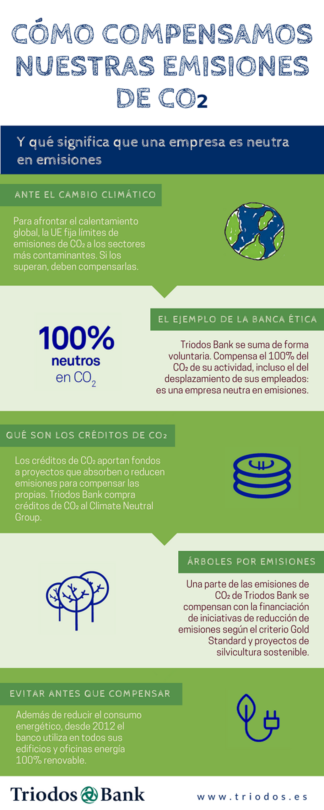 Triodos Bank, por su actividad, no está obligado por el Protocolo de Kioto a compensar sus emisiones de gases de efecto invernadero. Sin embargo, el banco decidió en el año 2000 compensar de manera voluntaria las emisiones de CO₂ que genera y que no puede reducir o evitar por otros medios.