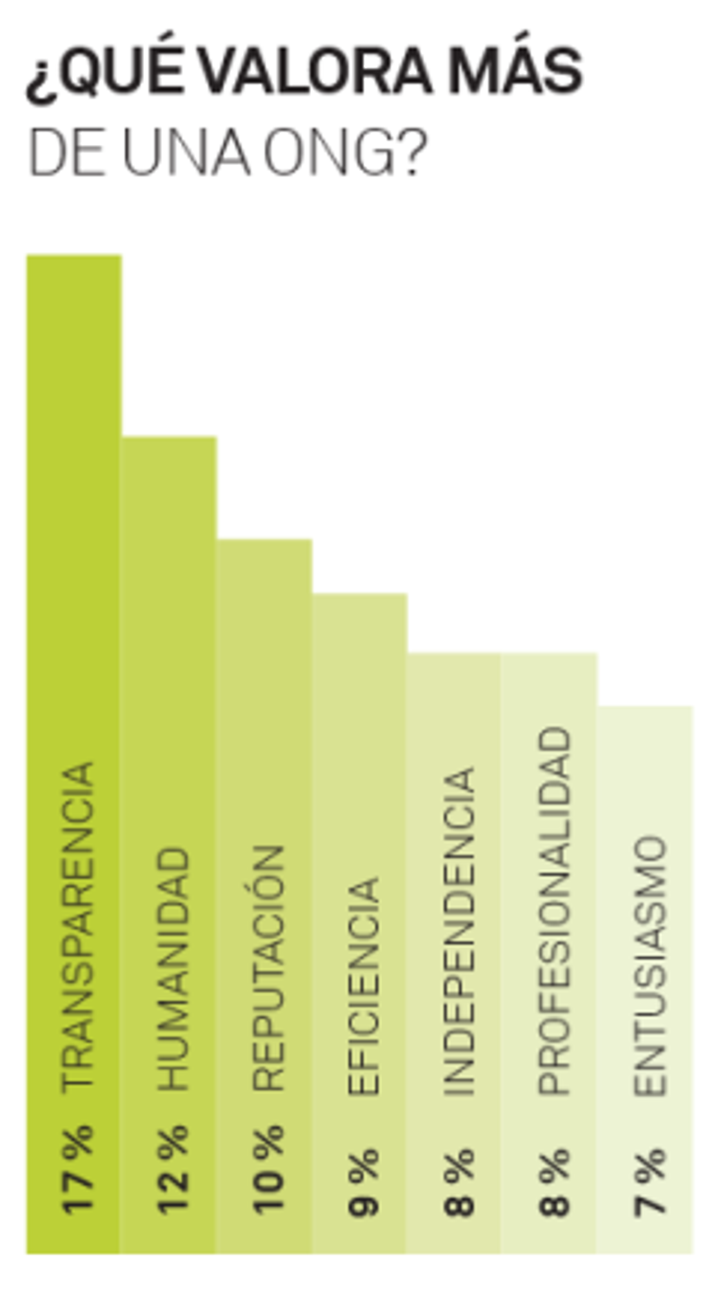 Sí se reducen, en cambio, las donaciones puntuales, de ahí nuevamente la importancia de implicar activamente a los socios. “Hacerse socio puede conllevar un compromiso mayor, y desde la asociación se vive como un gran apoyo y una declaración de principios compartidos”, destaca Liliane Spendeler, directora de Amigos de la Tierra. A cambio, aumenta el nivel de exigencia a las entidades en términos de profesionalidad y transparencia. “No sobran recursos y los españoles se vuelven más exigentes: quieren una ONG transparente (17 %), humana (12 %) y reputada (10 %)”, recoge el informe de la Fundación Adecco.