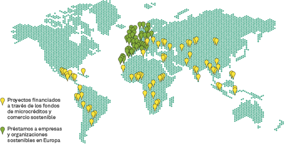 Por un lado, con el dinero de sus ahorradores, Triodos Bank ofrece financiación bancaria únicamente a empresas y organizaciones de los sectores social, cultural y medioambiental, que publica de forma transparente en su web. De esta manera, impulsa el desarrollo de sectores como el de la cultura, la integración social, la educación, la alimentación ecológica o las energías renovables.